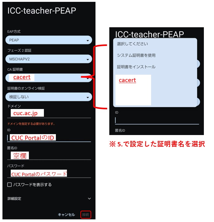 「ID」,「パスワード」にはそれぞれCUC PortalのID,パスワードと以下の設定項目を入力。