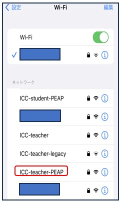 1.無線LANシステム利用可能エリアで“ICC-teacher-PEAP”をタップ