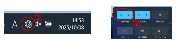 1.無線LANシステム利用可能エリアでタスクバーの①無線LAN接続アイコンをクリックし②Wi-Fi接続の管理をクリック。