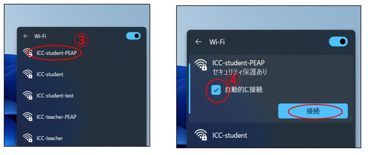 2.③ICC-student-PEAP”を選択し、 ④”自動的に接続”にチェックを入れ「接続」をクリック。