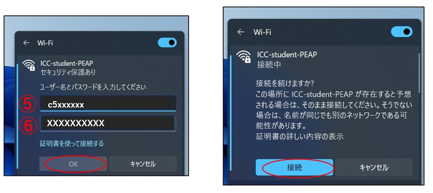 3.⑤「ユーザー名」,⑥「パスワード」にはそれぞれCUC PortalのID,パスワードを入力し「OK」をクリック、