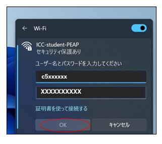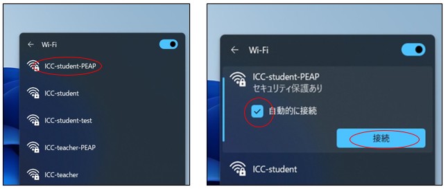 PC版 学内Wi-Fi接続方法(学生用) 1.無線LANシステム利用可能エリアで“ICC-student-PEAP”を選択し、 ”自動的に接続”にチェックを入れ「接続」をクリック。 2.「ユーザー名」,「パスワード」にはそれぞれCUC PortalのID,パスワードを入力,「OK」をクリック。