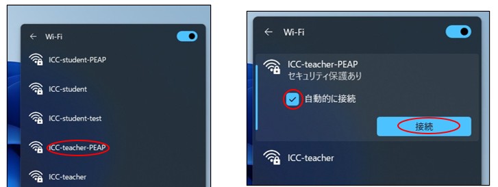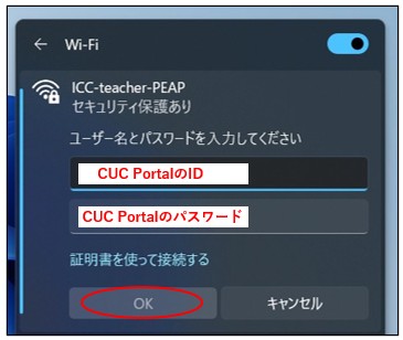 PC版 学内Wi-Fi接続方法(教員用) 1.無線LANシステム利用可能エリアで“ICC-teacher-PEAP”を選択し、 ”自動的に接続”にチェックを入れ「接続」をクリック。 2.「ユーザー名」,「パスワード」にはそれぞれCUC PortalのID,パスワードを入力,「OK」をクリック。