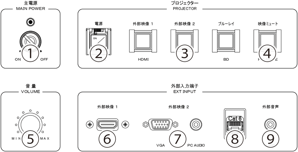 ① 主電源キースイッチ 鍵を回すことで機材が使用可能になります。ラックの扉も開錠されます。 ② プロジェクター電源 スクリーンの昇降は黒板の左下(A)のボタンで操作できます。 ③ 映像切替ボタン ④ 映像ミュート ボタンを押すとプロジェクターの映像と音声が出なくなります。 再度、映像と音を出す場合は、映像切替ボタン③でHDMIを押します。 ⑤ 外部音声/マイク音量 ⑥ パソコン接続端子(HDMI) ⑦ パソコン接続端子(VGA・オーディオ) ⑧ LAN端子 ⑨ オーディオプレーヤー等接続端子